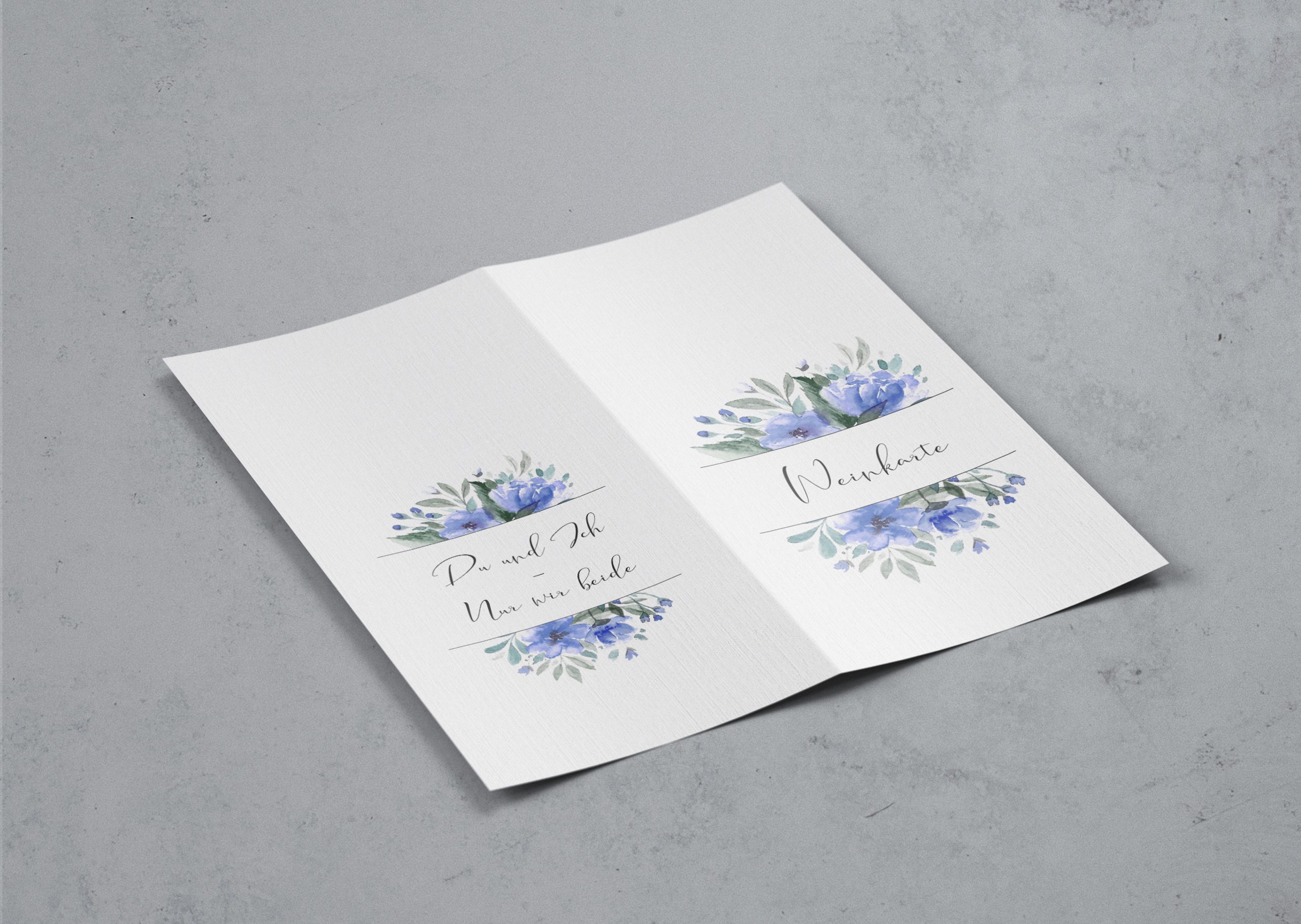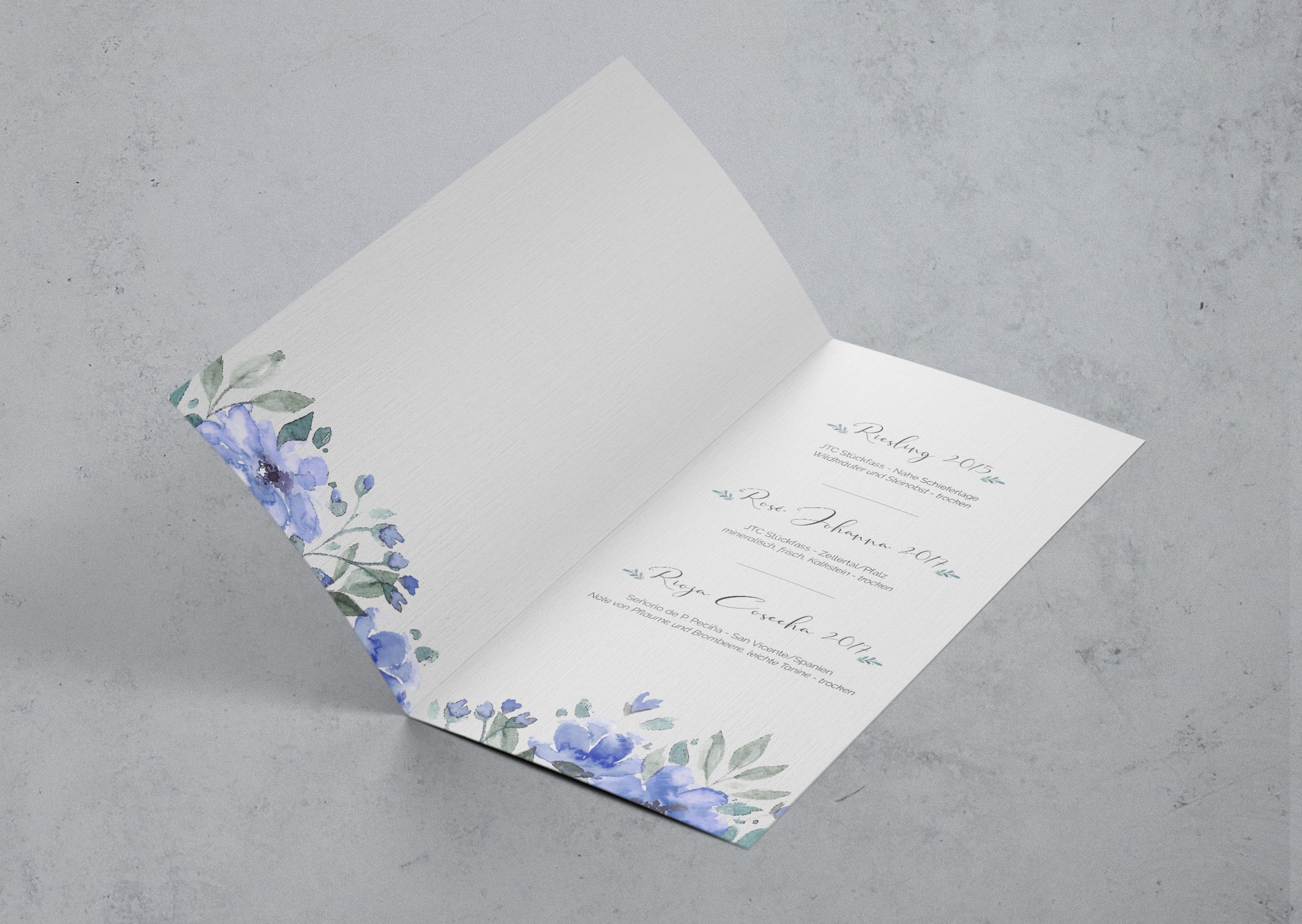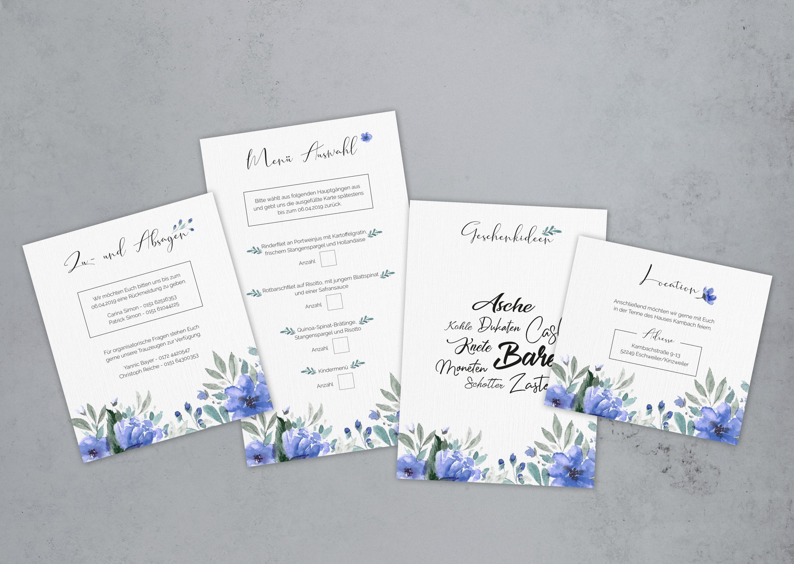 The content of this project is a wedding invitation and other print media that were needed for a wedding. The main component and recurring element are the illustrated blue flowers.