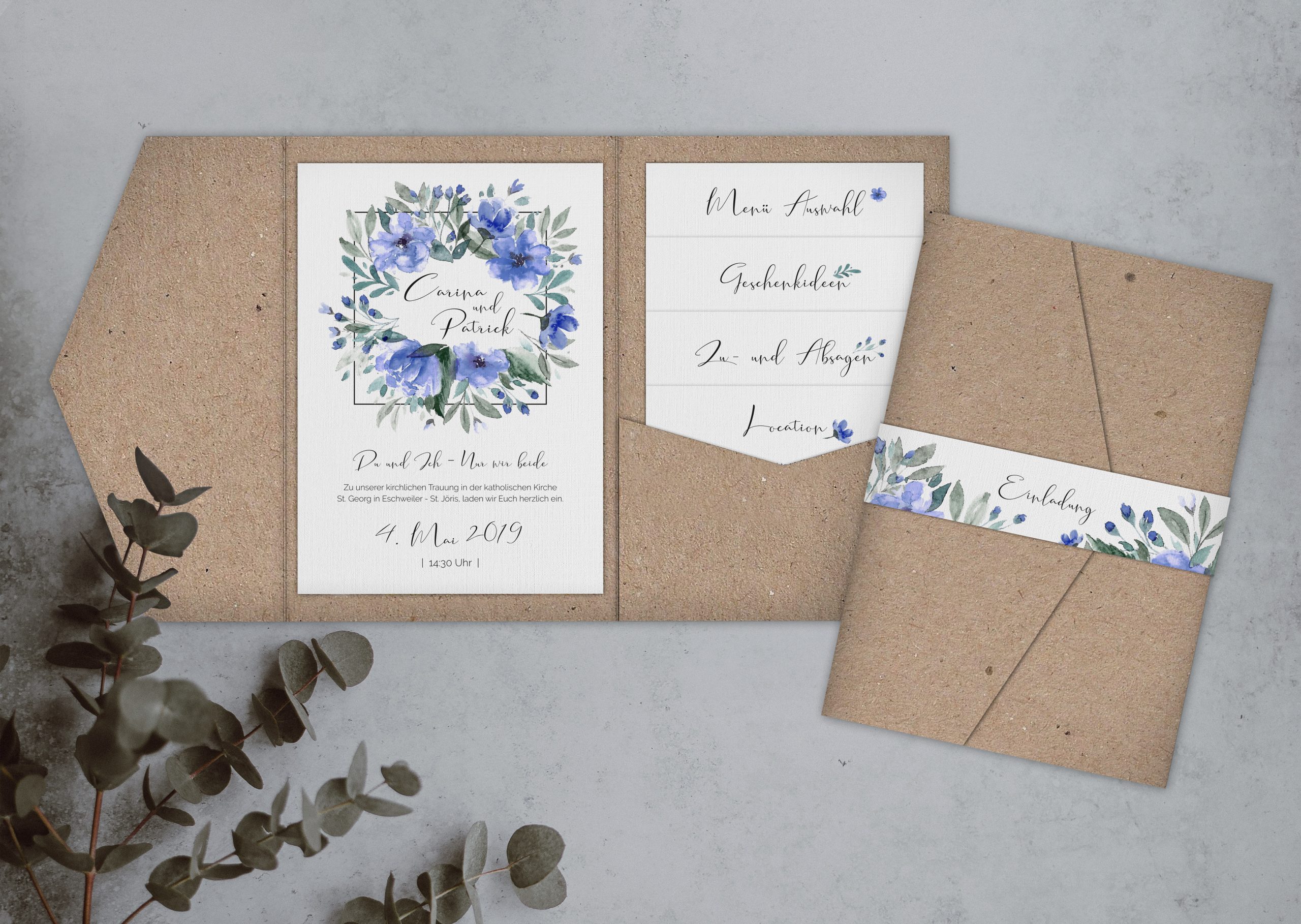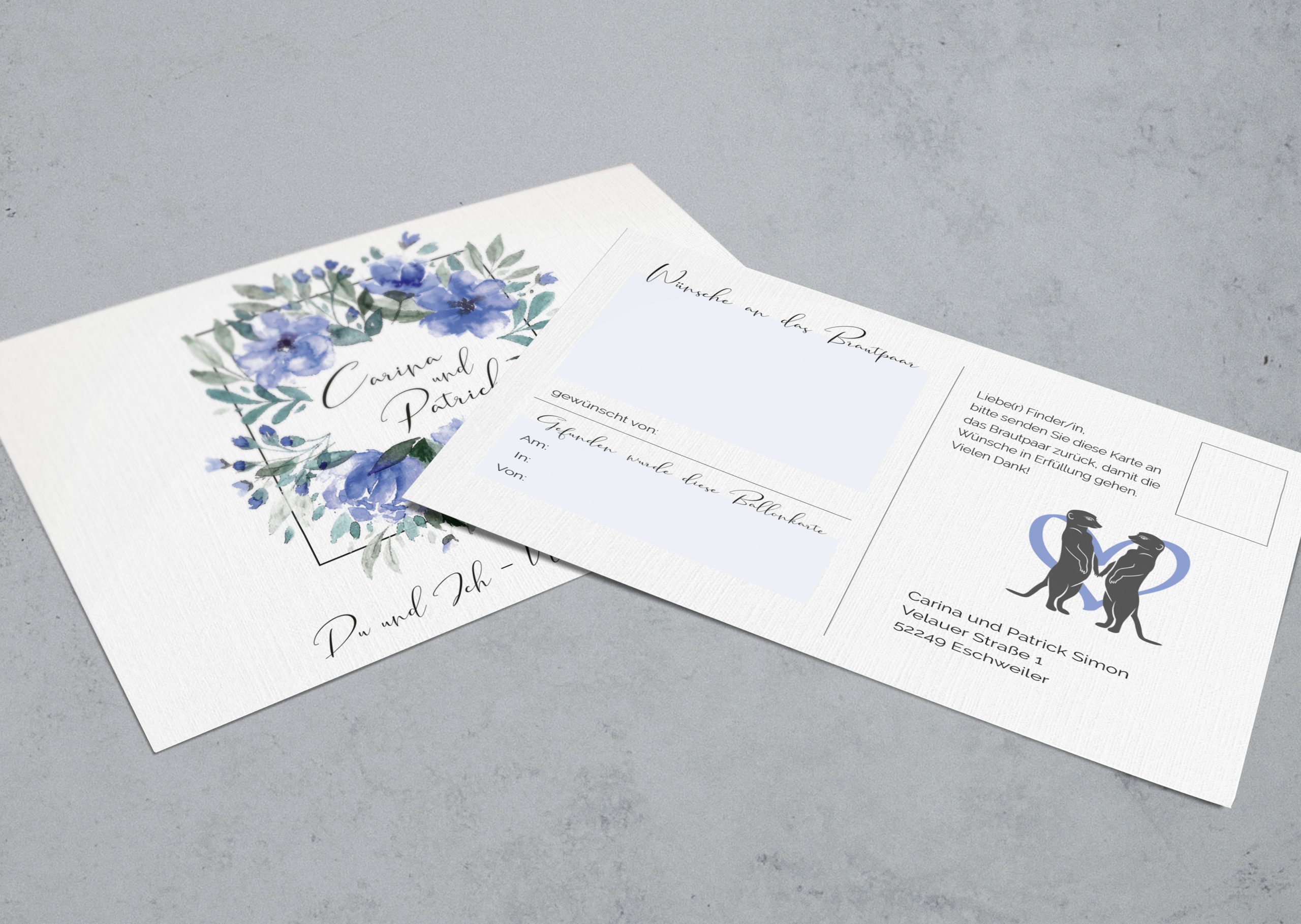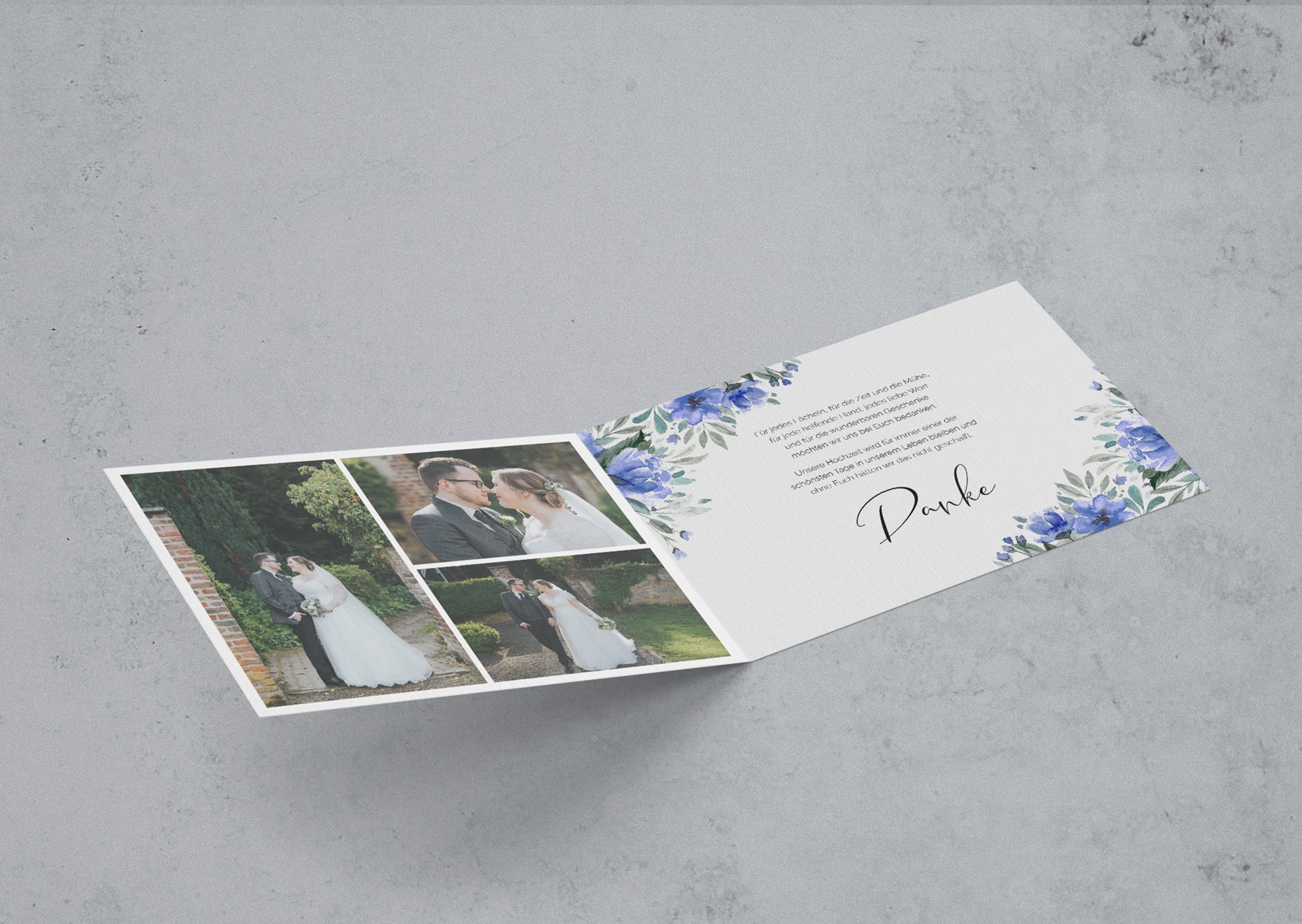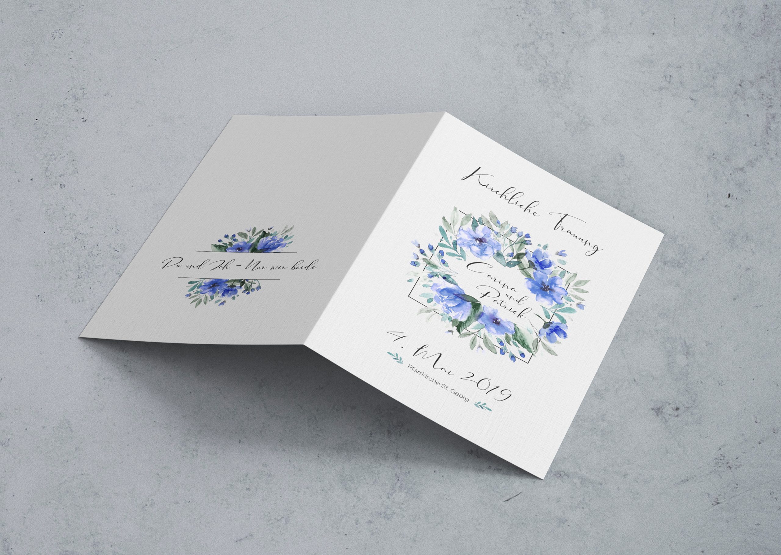 The content of this project is a wedding invitation and other print media that were needed for a wedding. The main component and recurring element are the illustrated blue flowers.